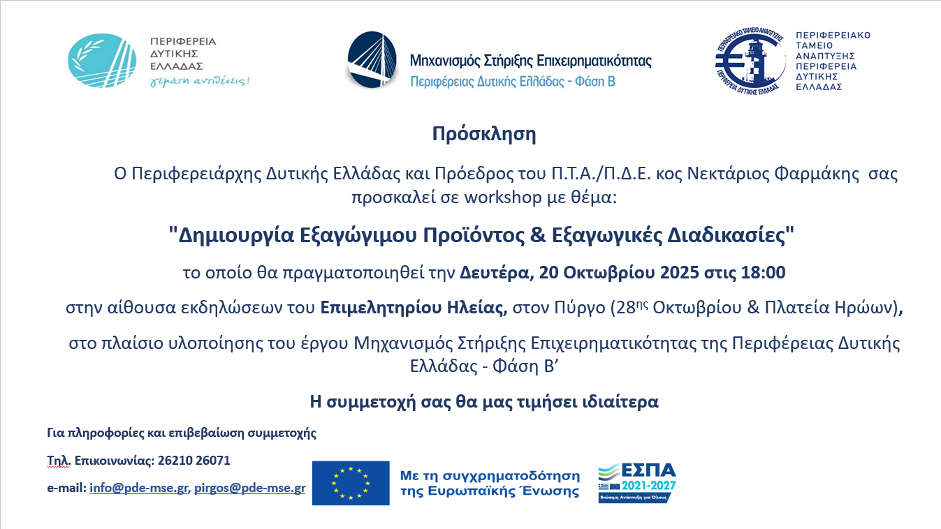 Ο Περιφερειάρχης Δυτικής Ελλάδας και Πρόεδρος του Π.Τ.Α./Π.Δ.Ε. κος Νεκτάριος Φαρμάκης σας προσκαλεί στο workshop με θέμα: